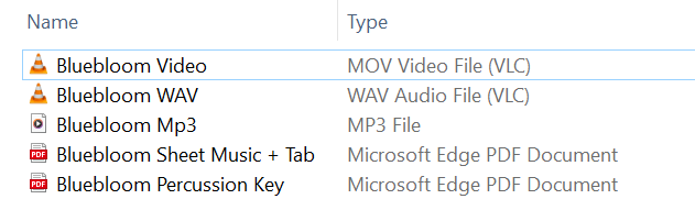 Zip file containing Sheet Music/Tabs with percussion key, video performance (MOV), and audio files (Mp3 and WAV).