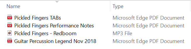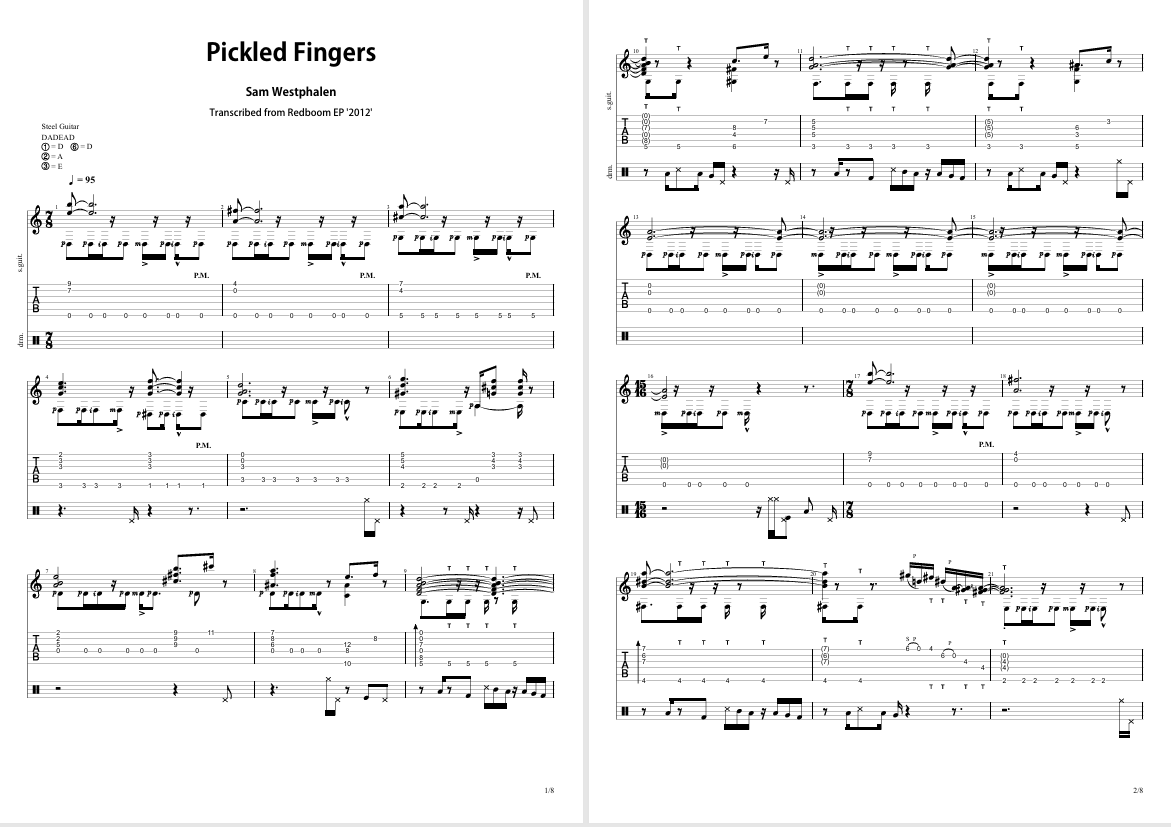 Zip file containing Tabs/Sheet Music (PDF), Percussion Notation Key (PDF) and Audio (MP3) for 'Pickled Fingers' from 2012 'Redboom' EP